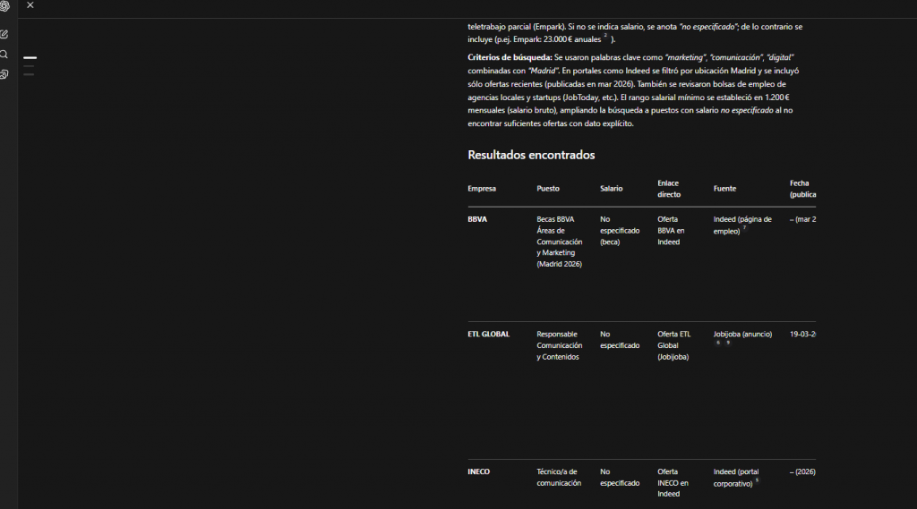 Una de las funciones más útiles es convertir la búsqueda en algo automático. Puedes pedir:“Busca cada día ofertas de marketing en Madrid a las 6:00 am y notifícame.”¿Qué consigues con esto?